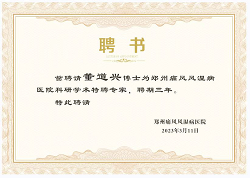 郑州痛风风湿病医院为了更好地推进科研学术建设工作,特聘请董道兴教授为医院科研学术特聘专家,并在活动现场为董道兴教授颁发聘书。